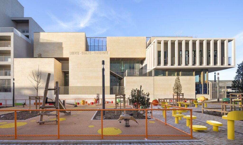 Interlocking stone volumes sculpt layered school complex. designboom.com – nov., 25 To the original article Projet associé School Les Fabriques School Complex